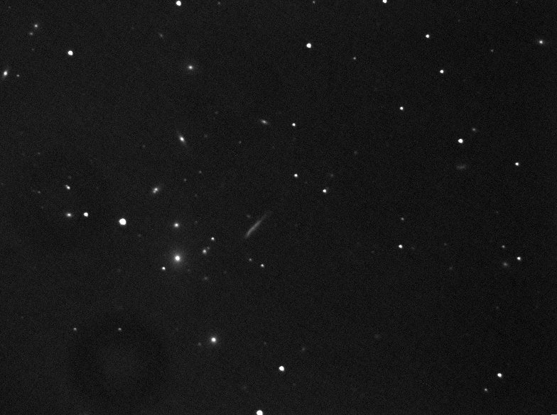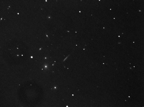 Viele kleine Galaxien kann man problemlos erkennen (NGC 3840, 3844, 3845, 3837). Belichtungszeit: 5 Minuten. Brennweite: C11 mit Fokal-Reducer: 1.75 Meter. Leider sind die Sterne zu leichten Strichen verzogen. Hier konnten die Einzelbilder nicht optimal addiert werden. Erhöht man den Bildkontrast bei diesem Bild weiter, so wird auch erkennbar, dass die Einarbeitung einer Flat-Field-Aufnahme unbedingt notwendig ist.