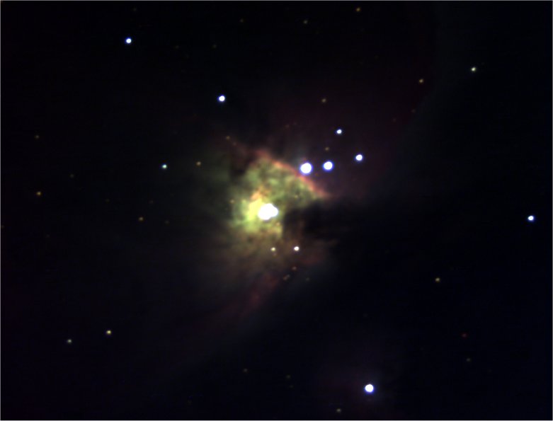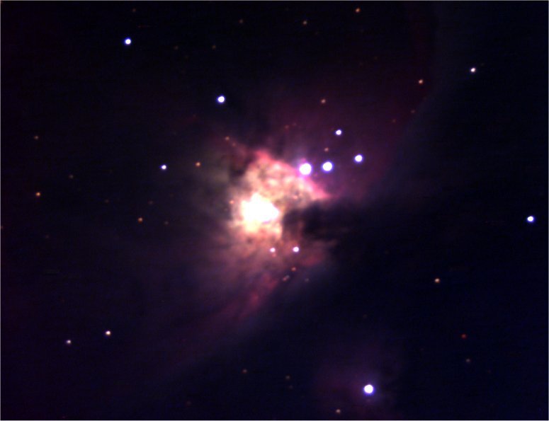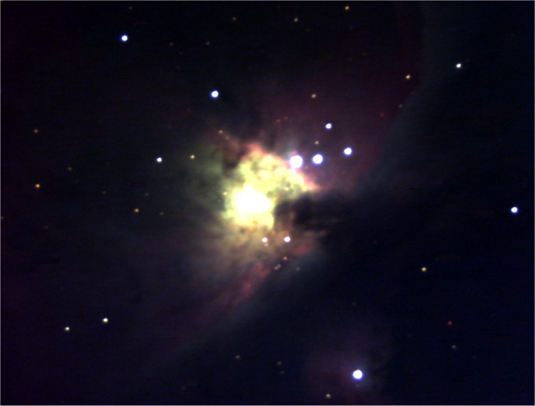 Diese Bilder von M42 (Großer Orion-Nebel, Sternbild: Orion) wurden am 29.03.2004 aufgenommen. M42 stand im Westen (so gegen 22:20 Uhr) schon ziemlich tief am Horizont. Trotzdem habe ich mein Fernrohr auf den Gasnebel eingerichtet, da ich im Filterrad meine neuen UBVRI-Messfilter eingelegt hatte. Ich wollte bei dieser Gelegenheit ausprobieren, welches Farbbild entsteht, wenn man die Filter R, B und V auswählt und ein ganz normales Farb-Komposit erstellt. Das Resultat ist oben zu sehen.