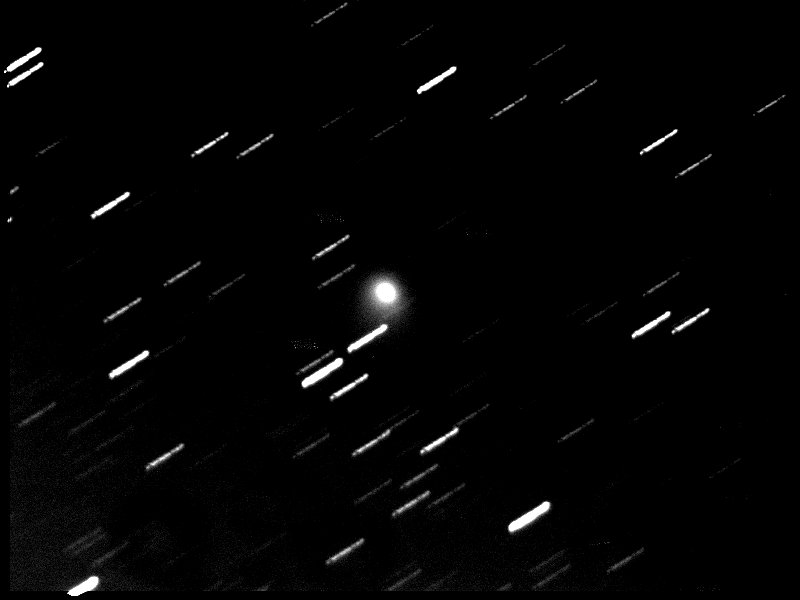 In der anderen Darstellungsart wird der Komet als Fixpunkt für die Addition der Einzelbilder verwendet. In diesem Fall ist natürlich der Komet selbst scharf abgebildet und die Stern erzeugen nun Strichspuren. Das Ergebnis ist in Bild 4 zu sehen: