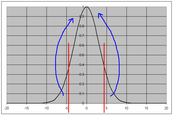 Im unteren Bereich der Kurve sieht man deutlich die Schmälerung. Die maximale Höhe ist etwas größer geworden. Durch die leichte Verschmälerung der gesamten Gauss-Funktion entsteht der Eindruck der Schärfung. Aber eigentlich findet hier gar keine "echte" Schärfung statt, da die Breite der Gauss-Funktion in halber Höhe gleich bleibt. Um eine echte Schärfung zu erzielen, muss diese Breite verringert werden.