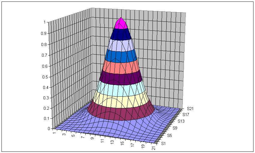 Abb. 7 zeigt eine berechnete "ideale" unscharfe Abbildung eines Sterns. Abb. 7 entspricht somit der Darstellung von Abb. 6 in Form der Intensität bei einem normalen Astro-Foto. X- und Y-Achse liegen jetzt in der Fotoebene, die Z-Achse ist die Intensität des jeweiligen Pixels.