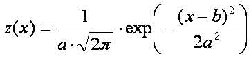 Gleichung 2 sieht nun schon wieder etwas komplizierter aus. Das soll uns aber nicht stören. Die Konstante a gibt die Breite der Gauss-Funktion in halber Höhe an und b gibt den Mittelwert an, d.h., die Stelle auf der X-Achse, an der die Gauss-Funktion ihr Maximum erreicht. Die maximale Höhe lassen wir im Moment einmal "links liegen". Diese Höhe kann leicht modifiziert werden, indem die "1" im Zähler des ersten Bruches in Gleichung 2 durch einen beliebigen Faktor ersetzt wird. Allerdings ist die maximale Höhe nun abhängig von der Breite der Gauss-Funktion. Je breiter die Funktion, desto niedriger ist sie.