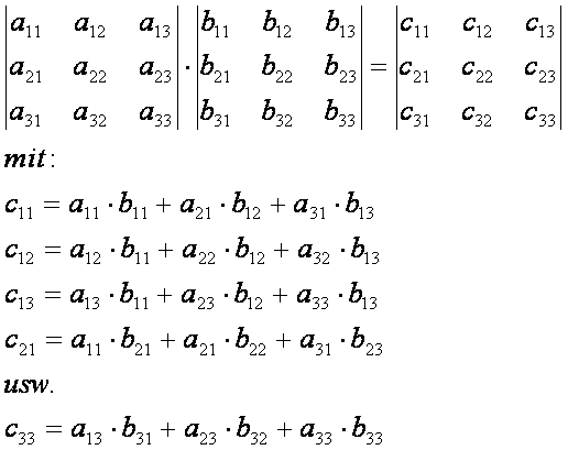 Bei einer Matrix-Multiplikation werden die Elemente einer Spalte und die Elemente einer Zeile der jeweiligen Matrix miteinander multipliziert und dann addiert. Diese Summe ergibt das Matrixelement in der Ergebnismatrix, und zwar an der Stelle, an der sich Spalte und Zeile kreuzen. Hier ein Beispiel mit zwei allgemeinen 3 x 3-Matrizen: