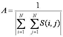 Hier ist die Konstante A für die Normierung der Intensität des Bildes verantwortlich. Durch die Multiplikation mit A ändert sich also die Gesamthelligkeit des Bildes nicht. Um den Faktor A zu berechnen, werden einfach alle Elemente des Schärfungsvektors addiert. Von der Summe wird dann der Reziprokwert (= 1 / Summe) gebildet (Gleichung 6).