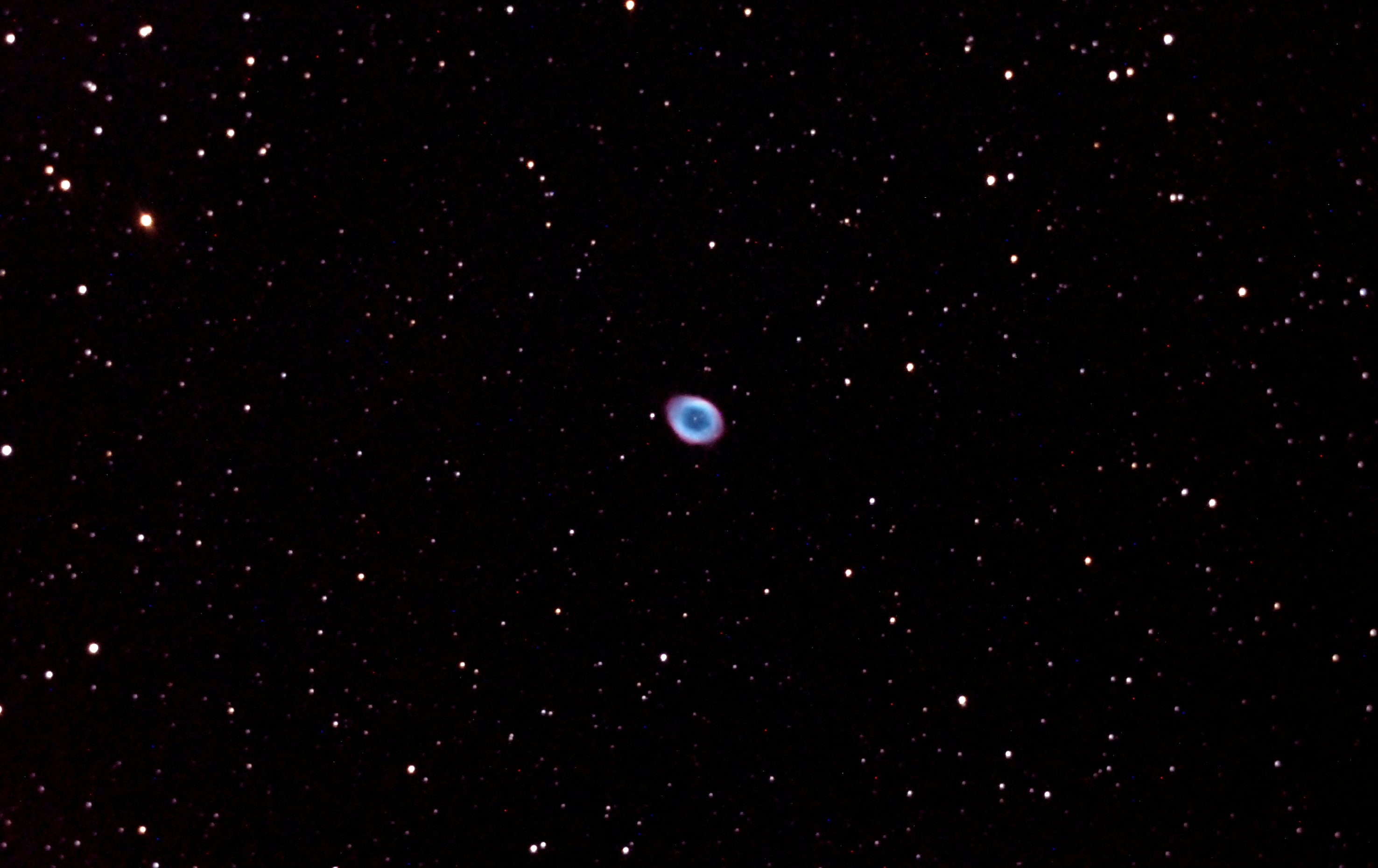 Das erste Beispiel zeigt M57. Bei diesem Bild wurde ein Schwarz-Weiß-Abgleich und eine geringfügige Farbkorrektur durchgeführt. Die Belichtungszeit betrug 3 min bei 3200 ASA. Weitere Bildbearbeitungsschritte wurden nicht durchgeführt. Das Bild wurde im Nikon-RAW-Format aufgenommen und im letzten Schritt in ein JPEG-Bild umgewandelt.