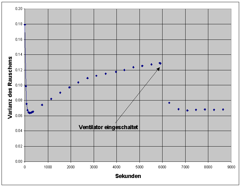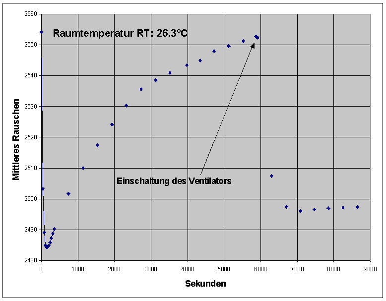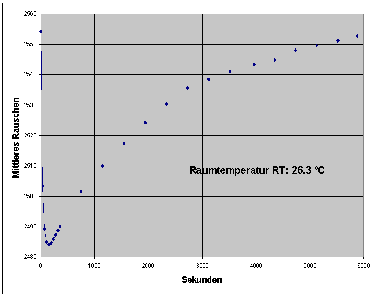 Was einem sofort auffällt ist, dass das Rauschen nach dem Einschalten stark abfällt und dann mit fortschreitender Zeit wieder langsam ansteigt. Dieses Ergebnis ist eigentlich nicht befriedigend, da das mittlere Rauschen nach ca. 1 Stunde wieder genauso groß ist, wie direkt beim Einschalten der Kamera. Bei diesem Diagramm sollte man jedoch bedenken, dass es zum einen sehr warm im Raum war (26.3°C) und das die Luft im Raum stillstand (kein Wind). Es herrschten also ungünstigste Bedingungen!
