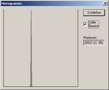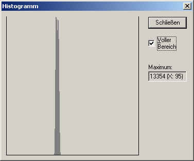 Wie man deutlich sehen kann, ist das Rauschen um so gleichmäßiger (d.h., die Varianz ist kleiner) auf dem Bild verteilt, je kälter die Kamera ist. Bei Bildern, die also mit einer "kalten" Kamera gemacht worden sind, lässt sich das Rauschen leichter "wegrechnen". Dies kann man auch in den Histogrammen sehen, die mit meinem Bildbearbeitungsprogramm entstanden sind. In Bild 5 ist das Astrobild vor dem Einschalten des Ventilators zu sehen (also ein "warmes" Bild). Bild 6 zeigt das dazugehörige Histogramm. Bild 7 zeigt dagen das letzte CCD-Bild nach Einschalten des Ventilators, also zu einem Zeitpunkt, als die Kamera schon wieder ordentlich abgekült war. Bild 8 stellt das entsprechende Histogramm dar.