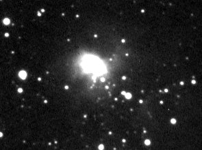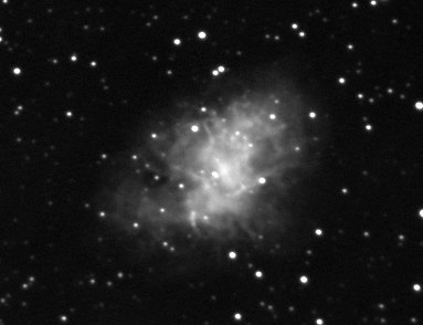 Das ist schon viel besser. Die Strukturen innerhalb von M1 sind deutlich zu erkennen und die Sterne sind schön rund. Bei diesem Bild wurde das Feature "Track & Accumulate" der SBIG-CCD-Software "CCDOPS" verwendet. Hierbei werden automatisch viele kurz belichtete Bilder (z.B. 30 Sekunden-Bilder, je nach Brennweite und Kamera-Auflösung) gemacht, das entsprechende Dunkelbild abgezogen und dann zu einem Gesamtbild addiert. Das spart viel Platz auf der Festplatte, da man die ganzen Einzelbilder nicht verwalten muss.