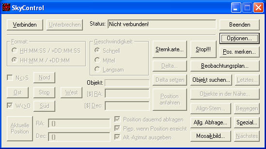 Abb. 1 zeigt das Steuerprogramm "SkyControl Version 1" direkt nach dem Start. Die Verbindung zum SkySensor-Steuergerät ist noch nicht hergestellt. Aus diesem Grund sind viele Funktionen noch ausgeschaltet und somit nicht benutzbar. Hierzu gehören natürlich auch alle Bewegungsfunktionen für das Teleskop.