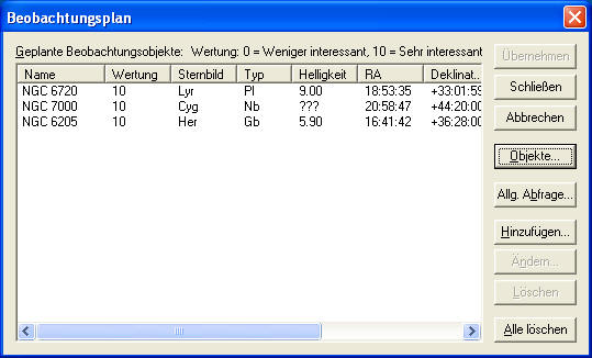 Bevor es dunkel wird, kann man mit dem Programm "SkyControl" einen Beobachtungsplan erstellen. Hierzu ist die Verbindung mit dem Teleskop nicht erforderlich. In Abb. 3 wird der Dialog des Beobachtungsplans mit drei ausgewählten Objekten gezeigt.