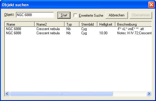 Soll nun eins dieser Objekte anvisiert werden, selektiert man es im Beobachtungsplan und klickt dann auf die Schaltfläche "Übernehmen" (die dann aktiviert ist). Im Hauptfenster von "SkyControl" wird die Position des Objektes in die entsprechenden Eingabefelder ("[$] RA" und "[$] Dec") eingetragen. Nun kann man auf die Schaltfläche "Position anfahren" klicken, um das Teleskop in die gewünschte Richtung zu bewegen. Die Auswahl der Beobachtungsobjekte kann u.a. über einen Auswahldialog erfolgen, in dem nach verschiedenen Objekten gesucht werden kann (Abb. 3). Diese Objekte (ca. 500000) sind in einer Datenbank hinterlegt.