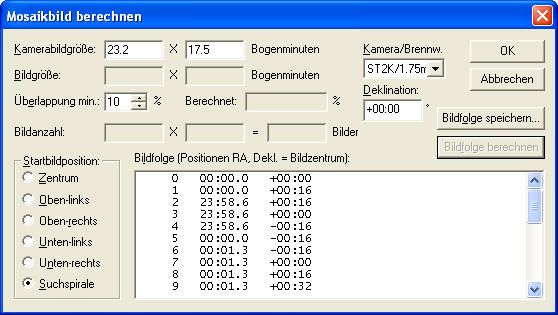 Nun können die in der "Bildfolge-Liste" angezeigten Positionen nacheinander angefahren werden. An jeder Position wird ein relativ kurz belichtetes Bild erstellt, um festzustellen, ob sich das gesuchte Objekt in diesem Bereich befindet.