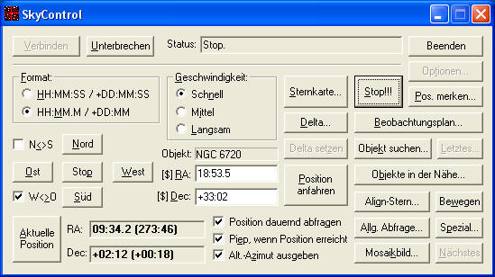Abb. 2 zeigt die Software, wenn das Teleskop mit dem Computer verbunden ist. Nun ist es möglich, das Teleskop mit der eingestellten Geschwindigkeit über die Tasten "Nord", "Süd", "Ost" und "West" zu bewegen. Außerdem kann in die beiden Eingabefelder "[$] RA" und "[$] Dec" eine Himmelsposition (Rektaszension und Deklination) eingeben und durch Anklicken der Schaltfläche "Position anfahren" wird das Teleskop an diese Stelle gerichtet.