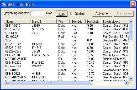 Es ist ebenfalls möglich, sich alle Objekte in der nächsten Umgebung der aktuellen Position ausgeben zu lassen. In Abb. 4 wurden die Objekte im Bereich +/- 1° von der aktuellen Position ausgegeben. Nun kann ein Objekt ausgewählt und die entsprechende Position angefahren werden.