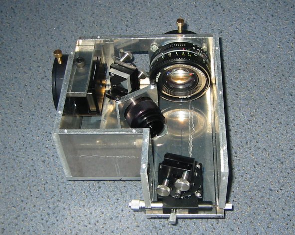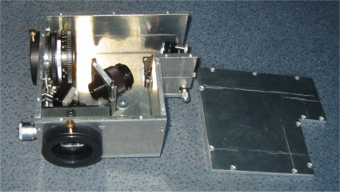 Oben wird das Spektrometer an das Telekop angeschlossen. Direkt darunter im Gehäuse ist der variable Spalt angeordnet. Dann wird das Licht gespiegelt und über eine verstellbare Linse auf das Gitter geworfen (linke Seite). Das Gitter ist auf einer drehbaren Plattform befestigt. Das gestreute Licht fällt dann in ein Objektv (line Seite unten). Dort ist dann außen die CCD-Kamera angeschlossen.