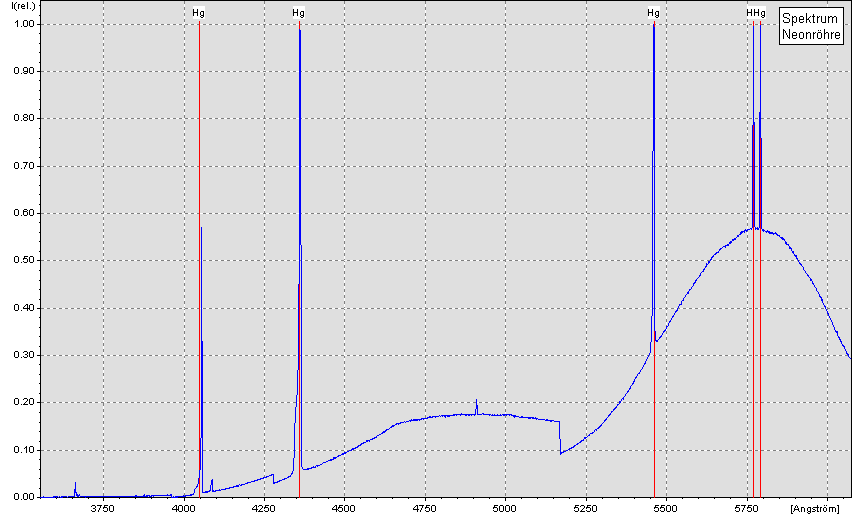 Da ja bisher noch keine klare Nacht war und man aber trotzdem irgendwie an ein Spektrum kommen will, ist es am einfachsten das Spektrum einer "Neon-Röhre" aufzunehmen. Dort kann man dann die Quecksilber-Linien im Bereich von 3000 bis 6000 Angström deutlich sehen und auch zur ersten Eichung des Spektrometers benutzen.