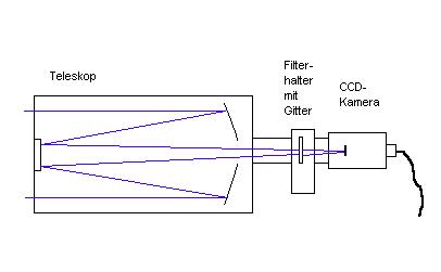 Wenn man die in vielen Farben leuchtenden Sterne auf den ersten Farb-CCD-Aufnahmen sieht, wächst in einem bald der Gedanke, etwas mehr über die Farben der Sterne und der anderen Objekte am Himmel zu erfahren. Da ich vor langer Zeit einmal Chemie studiert habe und dabei natürlich auch mit der Spektroskopie konfrontiert wurde, wollte ich die Spektren nicht nur mit einer Zylinderlinse direkt durch das Teleskop betrachten, sondern quantitativ als Spektrogramm erfassen. Dies ist mit einer CCD-Kamera und einem Gitter oder einem Prisma möglich. Ich habe mich für ein sog. Blaze-Gitter von der Firma Baader entschieden, da ich mit einem 8"- oder einem 11"-Celestron arbeite. Ein Prisma muss vor dem Objektiv des Teleskopes befestigt werden - und bei 11" ist das schon ein beachtliches Glasstück.