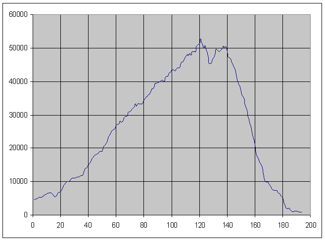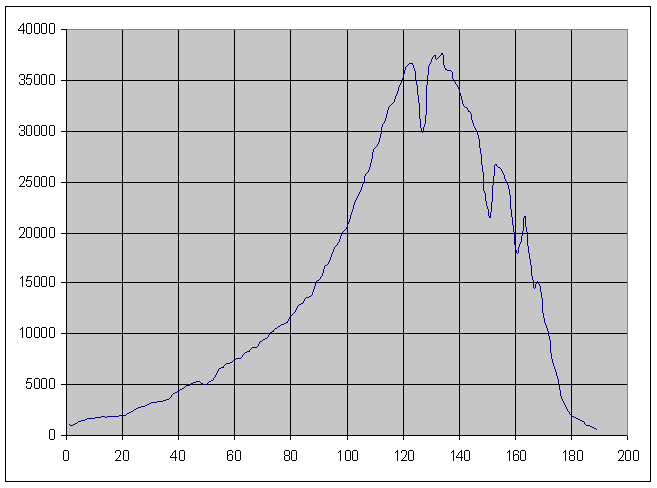 Der nächste Schritt ist nun, das Spektrum irgendwie auszuwerten. Mein erster Versuch war die Umwandlung der Pixeldaten des relevanten Spektrumteils in eine Textdatei, welche Zeile für Zeile die Pixelintensitäten (durch Semikolon) getrennt enthält. Diese Prozedur kann ich mit meinem selbst programmierten Bildbearbeitungsprogramm durchführen. Nun kann ich diese Textdatei in das Tabellenkalkulationsprogramm Microsoft Excel einlesen und in Form einer Garfik ausgeben (Bild 3).
