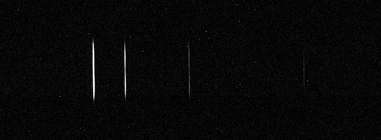 In Bild 2 können wir schnell vier Linien erkennen. Das Bild wurde bearbeitet (Dunkelbild, Flat-Field, Hot Pixel entfernt). Danach wurden jeweils 10 Pixel hohe horizontale Streifen mit der Spektren-Software SkySpec 2.0 auf dem Bild heraus gearbeitet. Das Gesamtspektrum zeigt Bild 3 mit einer Zuordnung der gefundenen Linien.