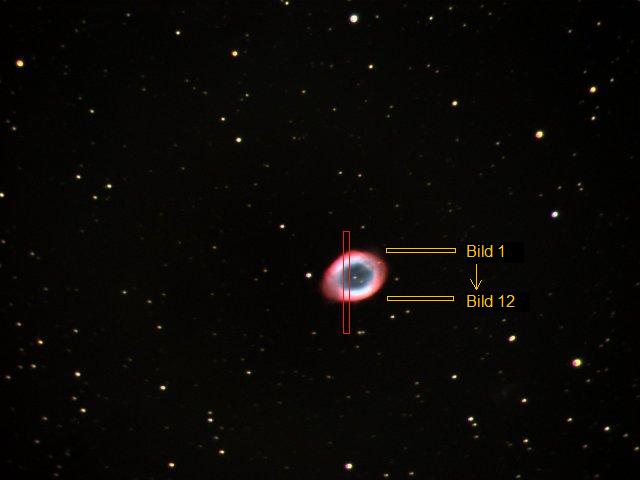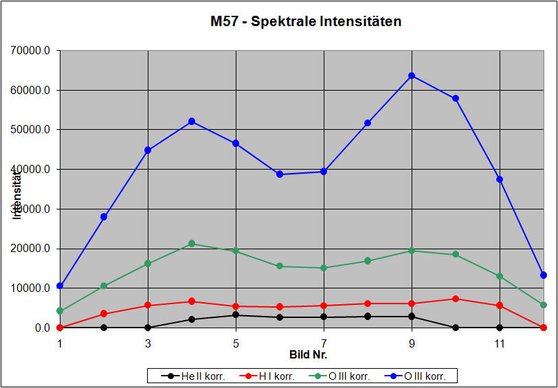 Die 12 Bilder, welche für die Auswertung benutzt wurden, waren jeweils 10 Pixel hoch und wurden von oben nach unten aus dem Gesamtspektrum (Bild 2) herausgelöst (siehe Bild 1). In der Grafik (Bild 4) kann man sehr gut die höhere Konzentration der Elemente im Randbereich des Nebels erkennen.