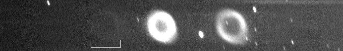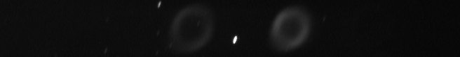 In Bild 1 ist noch nicht viel zu erkennen, ausser dass die Nachführung nicht so gut gelungen ist. Bei Bild 2 wurden das Photo vertikal gespiegelt, damit die langen Wellenlängen auf der rechten Seite des Bildes liegen. Zwei Spektrallinien, oder besser "Spektralringe", kann man in Bild 2 ganz deutlich erkennen. Bei genauem Hinschauen ist jedoch auf der linken Seite des Bildes, etwa an der Grenze des ersten Drittels, noch ein weiterer ganz schwacher Ring zu erahnen. Zur Verdeutlichung haben wir diesen Bereich durch einen weißen Kasten in Bild 2 markiert.
