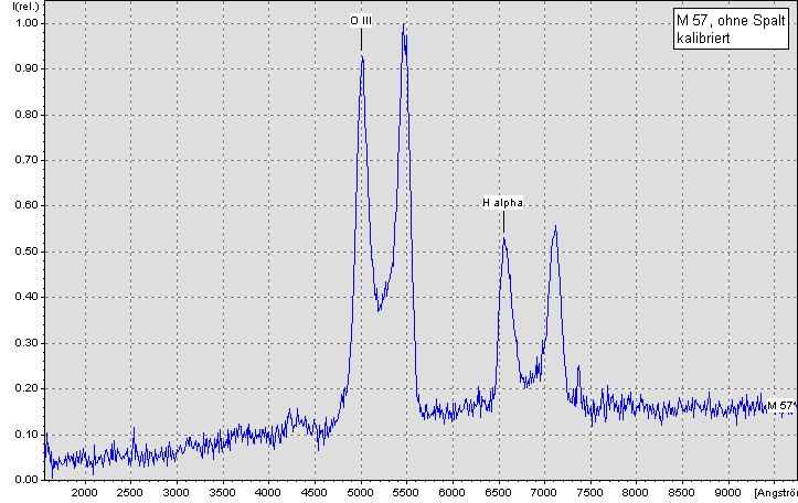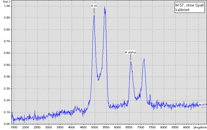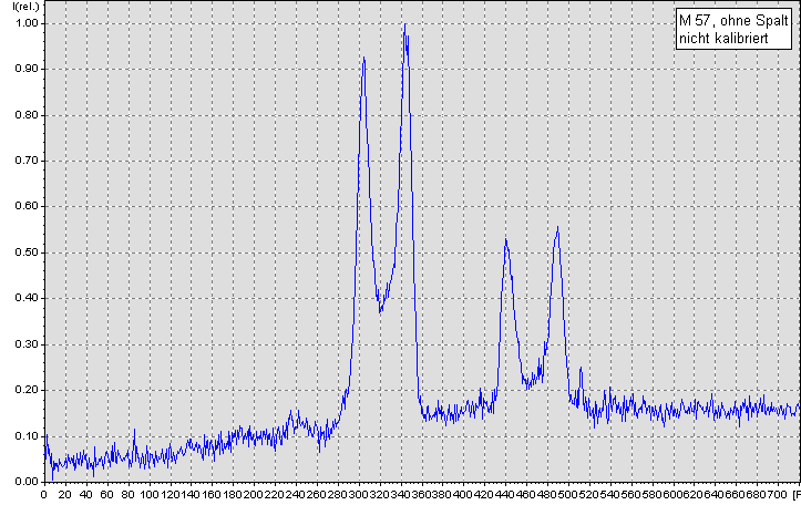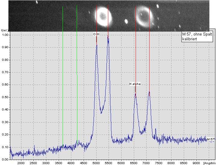 Im Mai 2001 haben wir mit dem Blaze-Gitter von Baader neben einigen Sternspektren auch das Spektrum von M 57 (Ring-Nebel in der Lyra) aufgenommen. Da das Bild eigentlich nicht so gelungen war, ist es ziemlich lange liegen geblieben, bevor wir uns nun doch an die Auswertung gemacht haben. Die Ergebnisse sind aber ganz passabel.