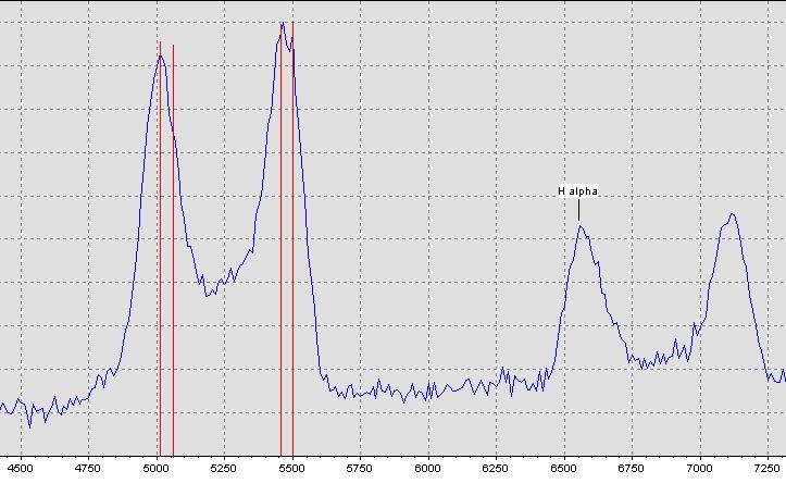 Zu Tabelle 2 ist noch zu bemerken, dass die O III-Linie eigentlich eine Doppellinie ist (5006.8 und 4958.9 Angström). Dazu jedoch später mehr. Wir benutzen zur Kalibrierung zunächst einmal die 5008er-Linie.